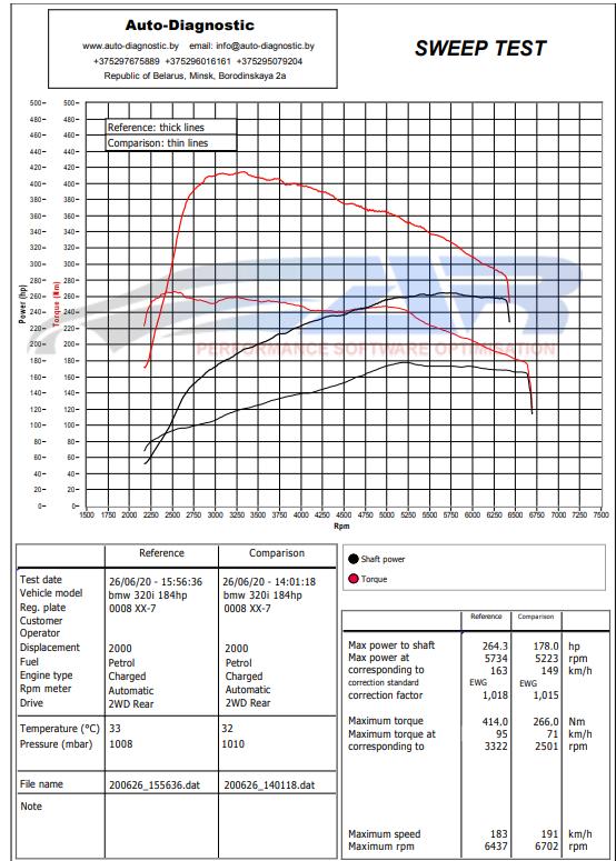 Here are the data on the characteristics for BMW Serie 4 420i Gasoline 184hp before and after the chip tuning, as well as graphs of measurements on the dyno.