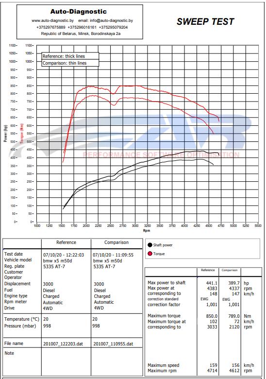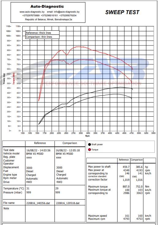 Here are the data on the characteristics for BMW X5 xDrive M50d Diesel 400hp before and after the chip tuning, as well as graphs of measurements on the dyno.