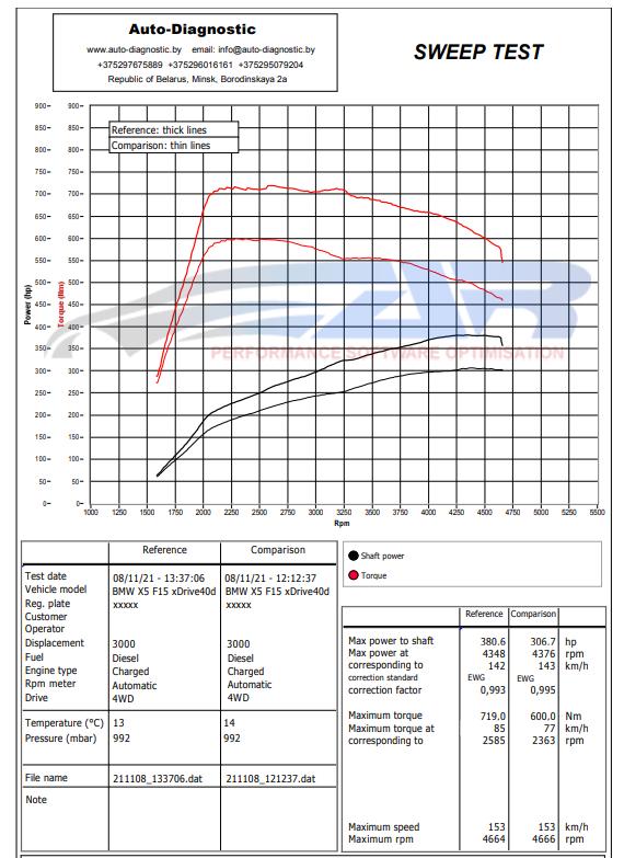 Here are the data on the characteristics for BMW X6 xDrive 40d Diesel 313hp before and after the chip tuning, as well as graphs of measurements on the dyno.